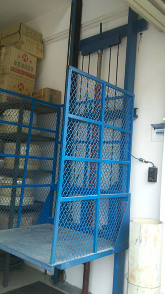 • 液壓式升降貨梯是在兩層之間運(yùn)輸貨物的一種設(shè)備,主要由兩列立柱,臺(tái)面和液壓驅(qū)動(dòng)部件等部分組成。載重可以從200kg到2000kg,臺(tái)面可以做到3米×2米,高度可以做到6米,上升速度為3.5米/分鐘。升降平臺(tái)的上升和下降是通過(guò)安裝在導(dǎo)軌里面的液壓油缸來(lái)實(shí)現(xiàn)的。液壓油缸是通過(guò)安裝在地面旁邊的液壓泵站提供動(dòng)力來(lái)驅(qū)動(dòng)的。一般標(biāo)準(zhǔn)的電源為三相380V,單相為220V也可??刂齐妷簽?4V。在每一層都安裝有控制盒及急停按鈕。超行程開(kāi)關(guān)安裝在頂部,防止設(shè)備超過(guò)設(shè)定高度運(yùn)行。防爆閥在油缸底部,防止油管爆裂,平臺(tái)突然下降。如果載重超過(guò)額定載重的120%,平臺(tái)將不會(huì)起升。每一層都安裝有和設(shè)備互鎖的門,只有當(dāng)平臺(tái)在那一層,那層的門才能開(kāi)啟,否則門是打不開(kāi)的。如果有一扇門沒(méi)有關(guān)好,設(shè)備是不會(huì)動(dòng)作的。這樣可以保障人員貨物的安全。